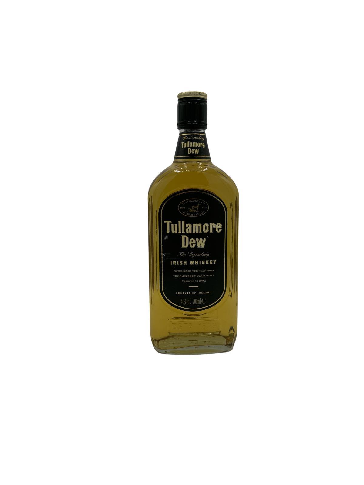 This is an old style bottle of Tullamore dew thought to be from the 90s. This is the original blend old labeling. Tullamore Dew is a smooth, mellow whiskey that is a blend of Pot Still and Grain Whiskeys which are presently distilled in Midleton Distillery in County Cork. On the nose, a mild blend of spicy, lemony and malty notes, with charred wood and vanilla undertones. Light bodied, sweetish spices, buttery and rounded with light citrus fruitiness.