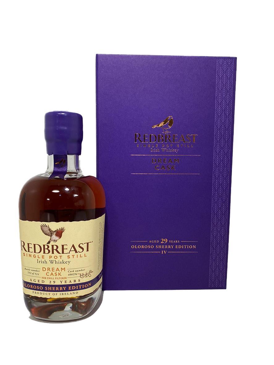 When selecting their whiskey of choice for this fourth release, Leighton and Blender Dave McCabe combined innovation, tradition, and time-honoured craftsmanship by vatting together four special whiskeys, aged for a minimum of 29 years in ex-bourbon, sherry, and ruby port seasoned casks. The whiskeys were then married in a single outstanding Oloroso sherry butt from Jerez de la Frontera in Spain’s Andalusia region and left to mature for a further 15 months to bring an evolution of its characteristic flavours to the Redbreast experience. Having launched on world whiskey day only 914 bottles were made available. This is Bottle 592. The bottle and box are in great condition.