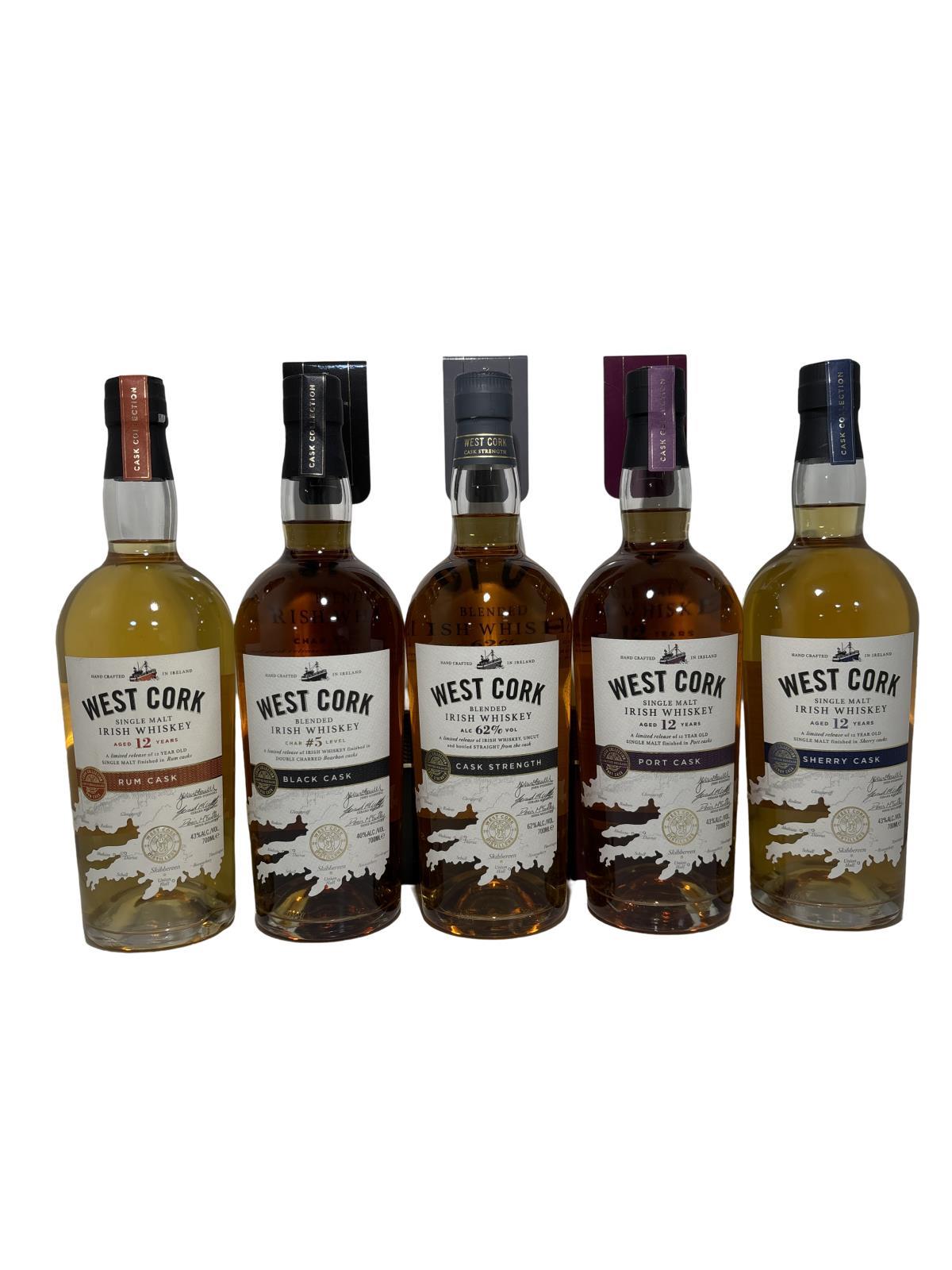 A collection of 5 whiskeys from their cask collection series this has 3, 12 year old Single malts finished in Sherry, Port, and Rum casks. Along with the Cask strength edition and black cask Char #5. A 12 year old single malt released by West Cork Distillers and finished in a port wine cask. This is light and delicate in style with sublte fruit flavours and chocolate notes coming from the port cask finishing. A fine 12 year old single malt that has been finished in top quality sherry barrels.A fruity, delicate and light single malt that has been finished in the finest rum casks from the West Indies. This blend from West Cork has gone through some clever finishing in highly charred bourbon barrels. Each barrel is double charred to 'level 5' which delivers enhanced vanilla flavours, sweetness and smoothness to the whiskey.A natural cask-strength bottling from West Cork Distillers. This is a blend of grain and malt whiskeys which have been married in ex-Bourbon barrels.