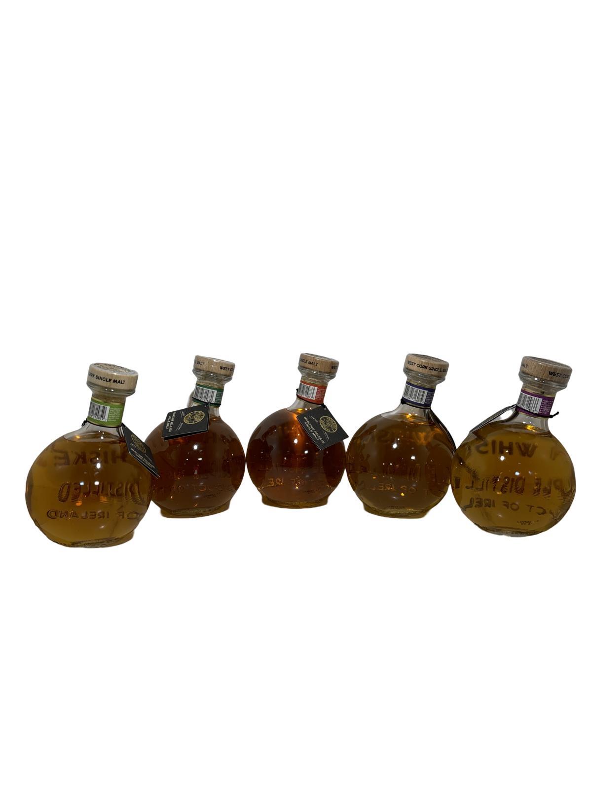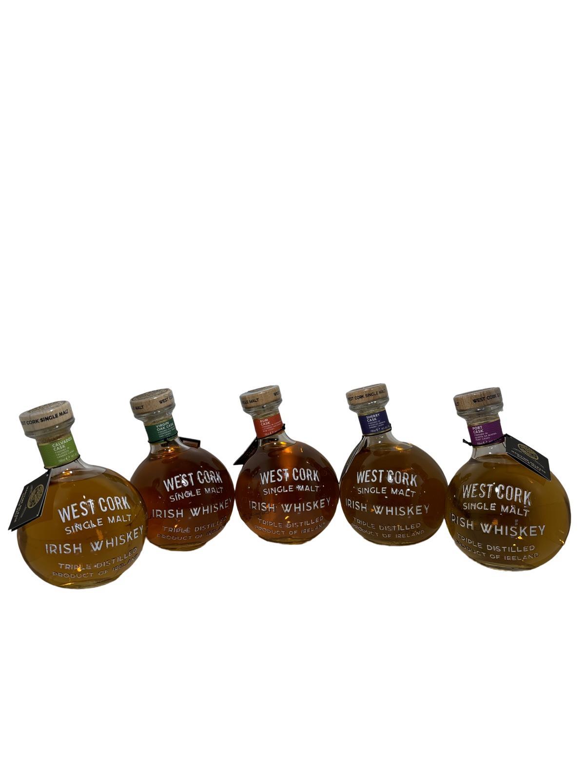 The full 5 bottle Maritime collection with the exclusive airport bottling. Presented in a bespoke Maritime shaped bottle, this unique maritime Irish Whiskey range is inspired by the founders and background of West Cork Irish Whiskey. The Maritime range bottle is a masterfully crafted custom-blown spherical bottle with an off centre spout to aid a smoother pour of whiskey. The core of this range comprises rum cask, port cask, sherry cask and virgin oak cask single malt. With the Airport bottling being a limited run in Calvados Casks.