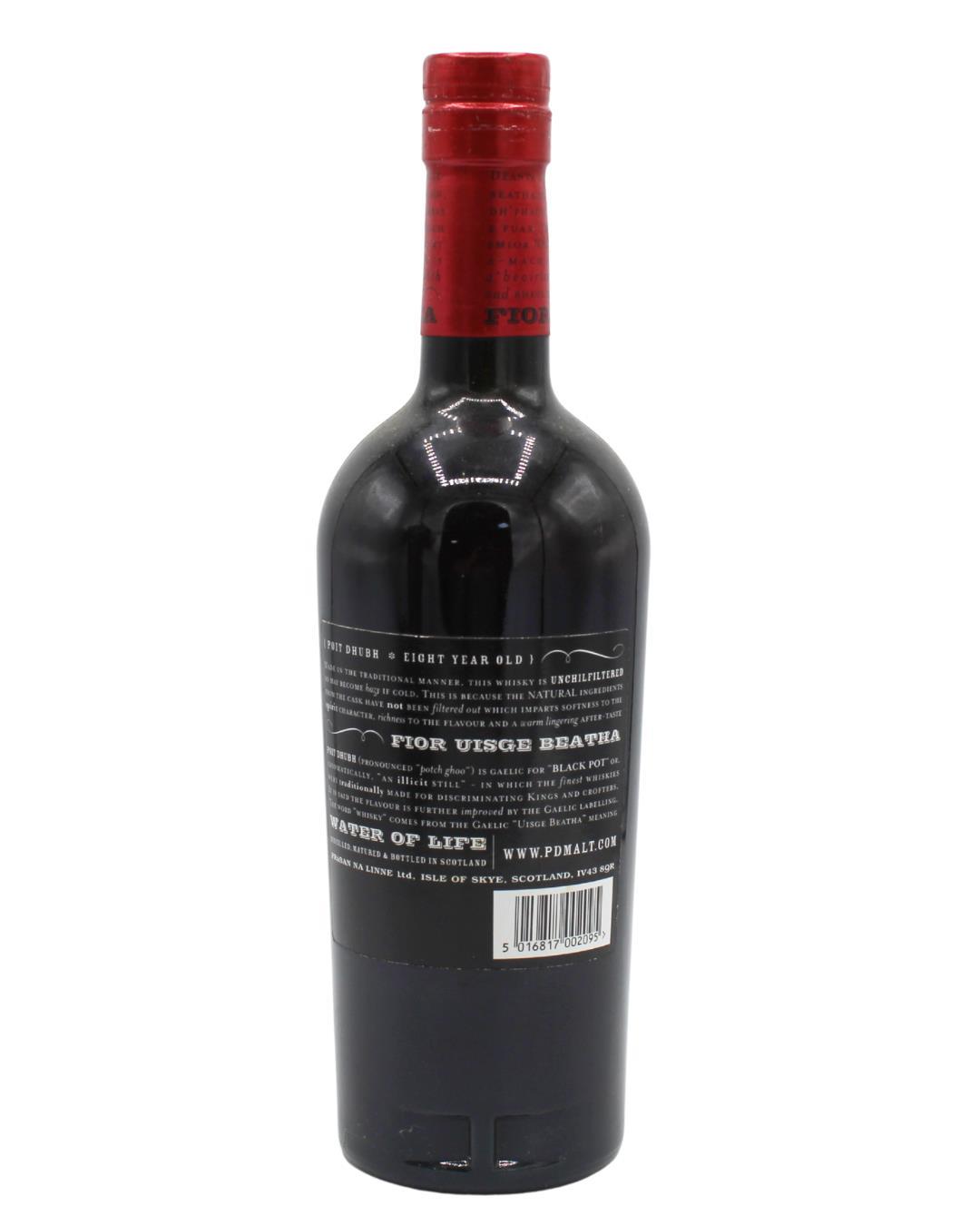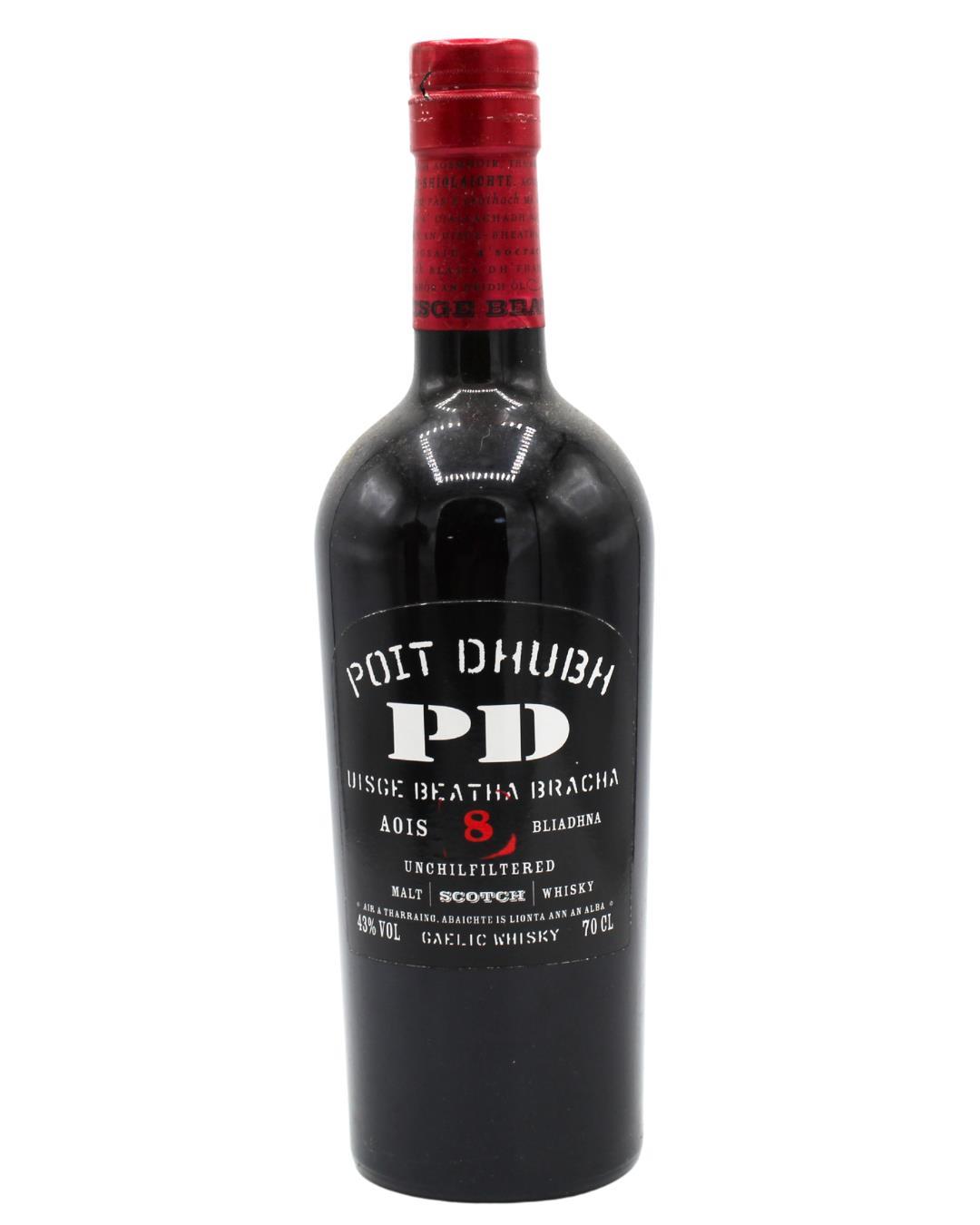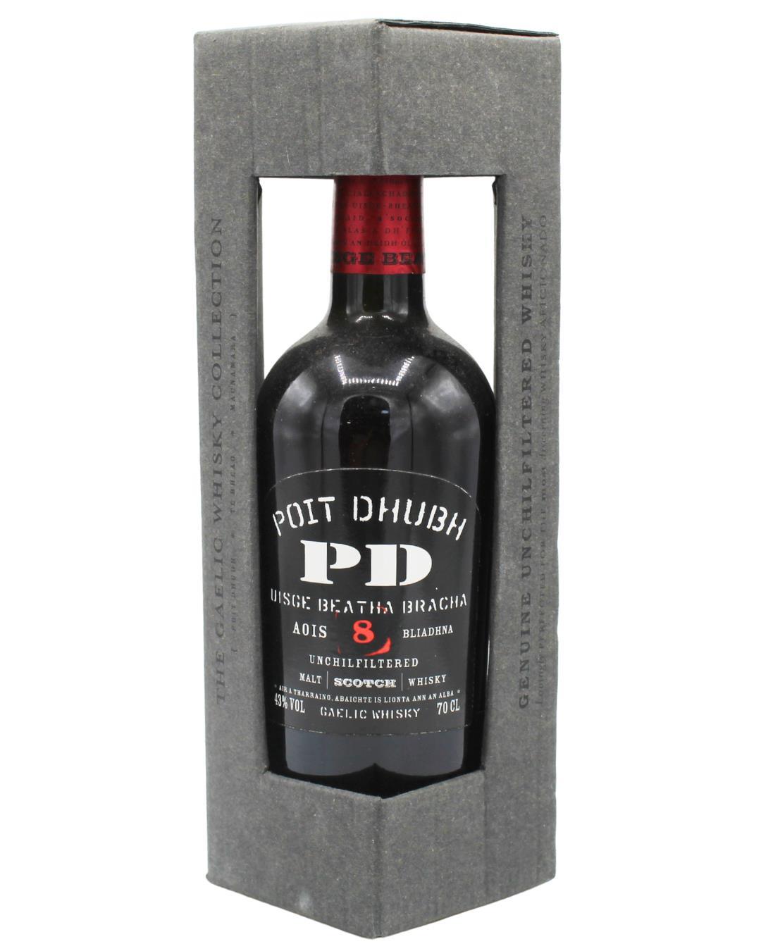A bottle of Poit Dhubh 8 Year Old, a blended malt bottled by Phraban Na Linne, a company set up in 1976 to provide whisky for the Gaelic speaking islands of Scotland.