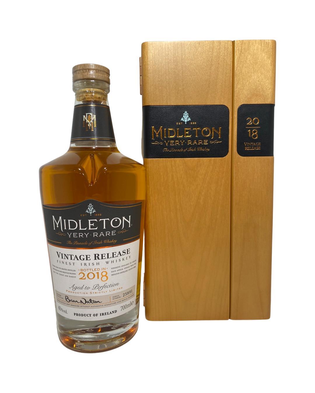The Midleton Very Rare 2018, is a bottling brought out by the Midleton Distillery in Co. Cork. The ‘Midleton Very Rare’ range was launched in 1984 and a new vintage has been released every year since then. Barry Crockett started off the ‘Midleton Very Rare’ range while he was the Master Distiller of Midleton Distillery, in 2013 Barry Crockett retired from his role of Master Distiller. From 2014 onwards Brian Nation has been creating the ‘Midleton Very Rare’ range, maintaining its role as standard-bearer and pinnacle of Irish Whiskey. The bottle and gift box in great condition also include the cert and distillery invite.