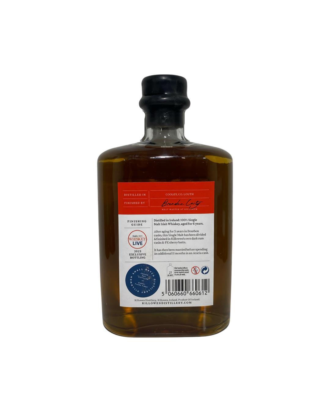 Released exclusively for Whiskey Live 2023 by Killowen. A single malt Irish whiskey aged for 5 years in Bourbon casks and finished in dark rum and PX sherry butts. The married together spending an additional 11 months in an Acacia cask.