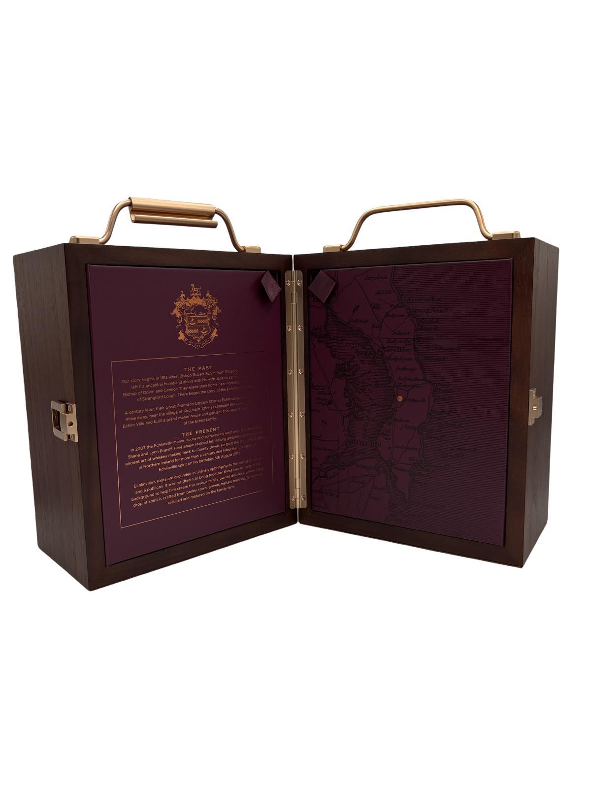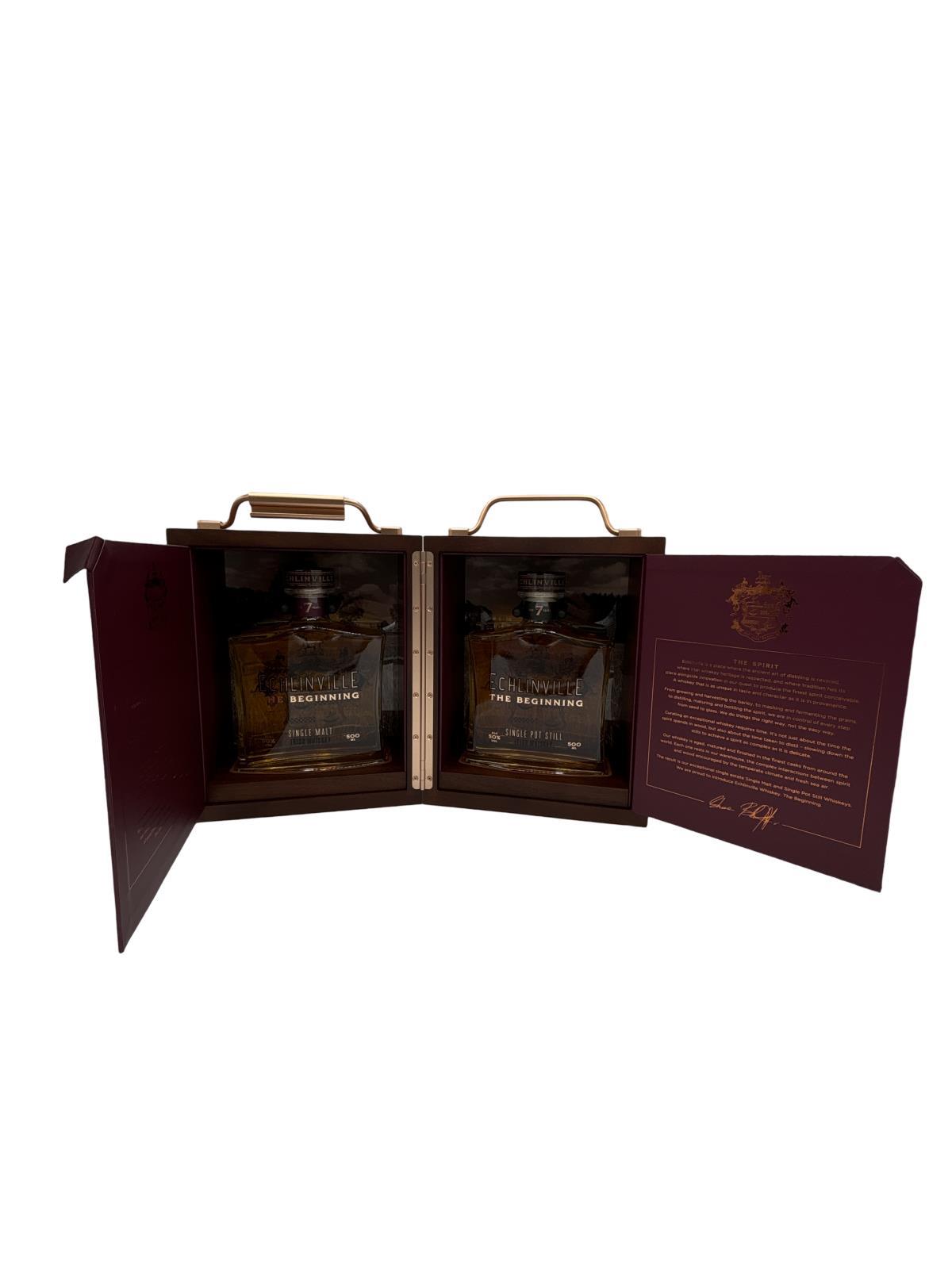 Echlinville – The Beginning is a pair of exceptional seven year old Pot Still and Single Malt Single Estate Whiskeys, crafted from field-to-glass at The Echlinville Distillery and bottled at 50% ABV. This luxiourous set is beautifully presented in a stunning walnut and copper effect collector's box. Expertly curated from a vatting of carefully selected seven to nine year-old whiskeys from ex-bourbon casks, this spirit has been distilled exclusively from barley grown, harvest and floor malted on the Echlinville farm. Every step of the process thereafter – from mashing and fermenting the grains, to casking and dunnage maturing the spirit, to filling and labelling the bottles – has been completed on-site at The Echlinville Distillery. With provenance, terroir and a proud sense of place at its heart, Echlinville – The Beginning reveals the true character of their distillery and their spirit. Echlinville – The Beginning Single Pot Still Irish Whiskey boasts notes of pineapple, kiwi, coconut and cream soda, delicately balanced with ginger, pine, mint and white pepper, full bodied with a waxy texture. Echlinville – The Beginning Single Malt Irish Whiskey is characterised by blood orange, raspberries and green apples, complemented by saline notes alongside warming clove, cinnamon, chocolate, coffee, honey and a touch of tobacco.