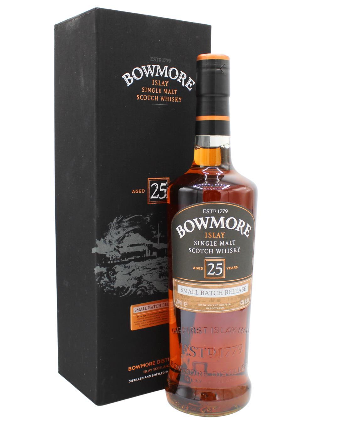 Consistently one of the best 25 year old Scottish single malt. Bowmore has a fortunate knack of being capable of long, extended ageing. Some of the distillery's oldest bottlings are amongst the most highly collectable in the world. This has a rich and complex character with a wonderful combination of chocolate, dried fruit, roasted nut and pungent smoke flavours.