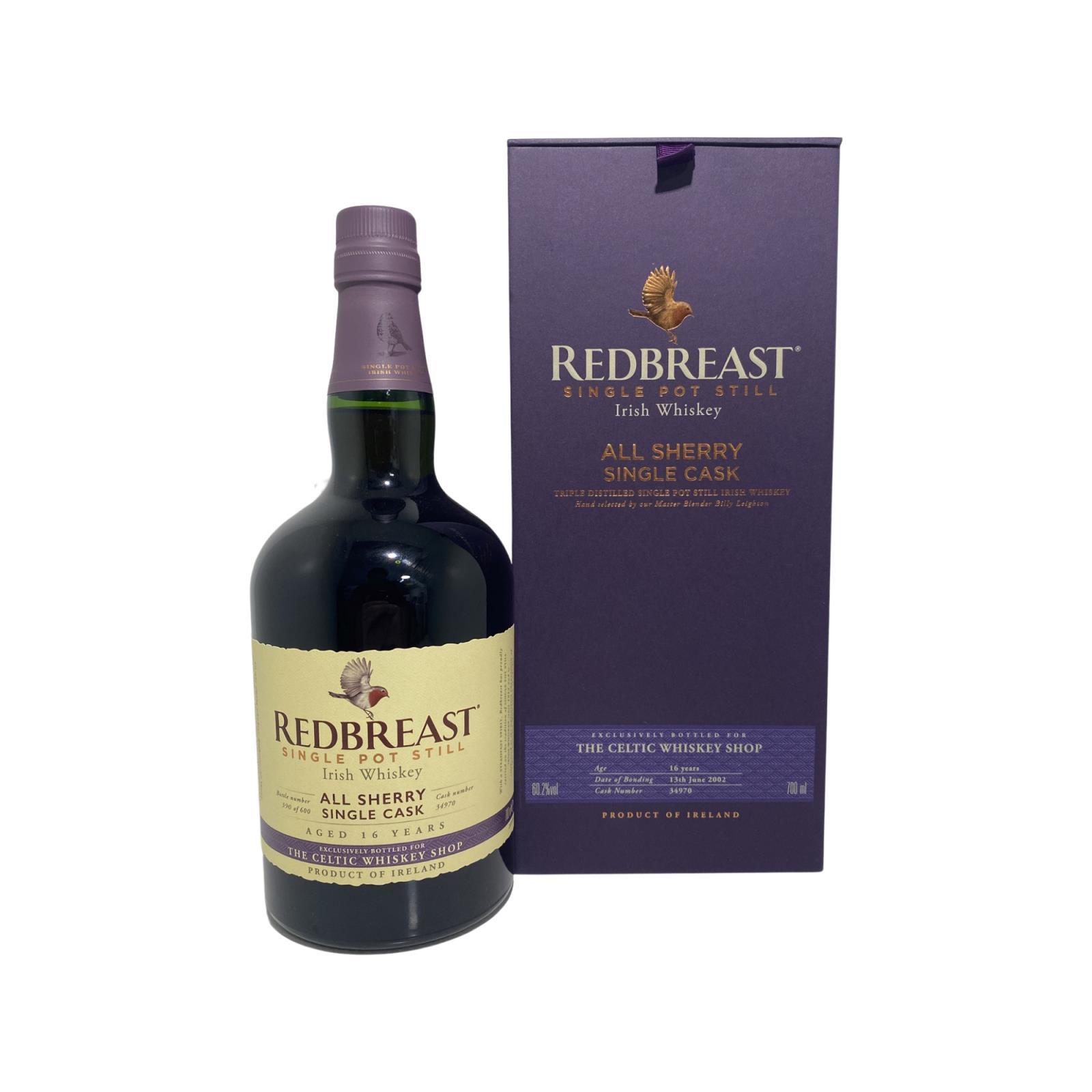 When it comes to Single Casks its hard to beat Redbreast All Sherry. This is the new LIMITED EDITION Single Cask from Redbreast whiskey, hand selected and bottled exclusively for the Celtic Whiskey Shop. This single pot still is tripled distilled and entirely matured for 16 years in Oloroso Sherry Casks. Bottled at 60.2%, single cask 34970 is limited to just 600 bottles.