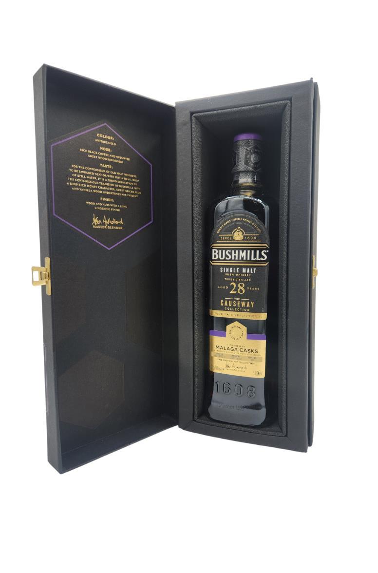 Part of the Bushmills 'The Causeway Collection'. A 28 year old single malt, matured in Olorosso sherry & bourbon casks and finished in Malaga casks. Bottle No. 323