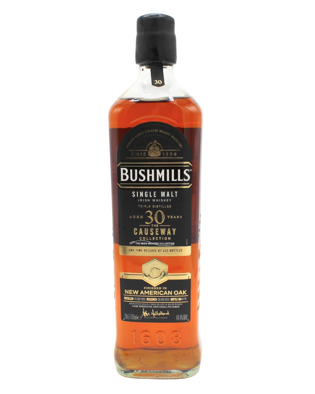 Part of the Bushmills 'The Causeway Collection'. Exclusive for Dublin and Cork Airport. The Bushmills 30 Year Old New American Oak Cask Single Malt was matured for 14 years in Oloroso sherry & Bourbon casks and finished for 16 years in American oak casks. Bottle No. 079.