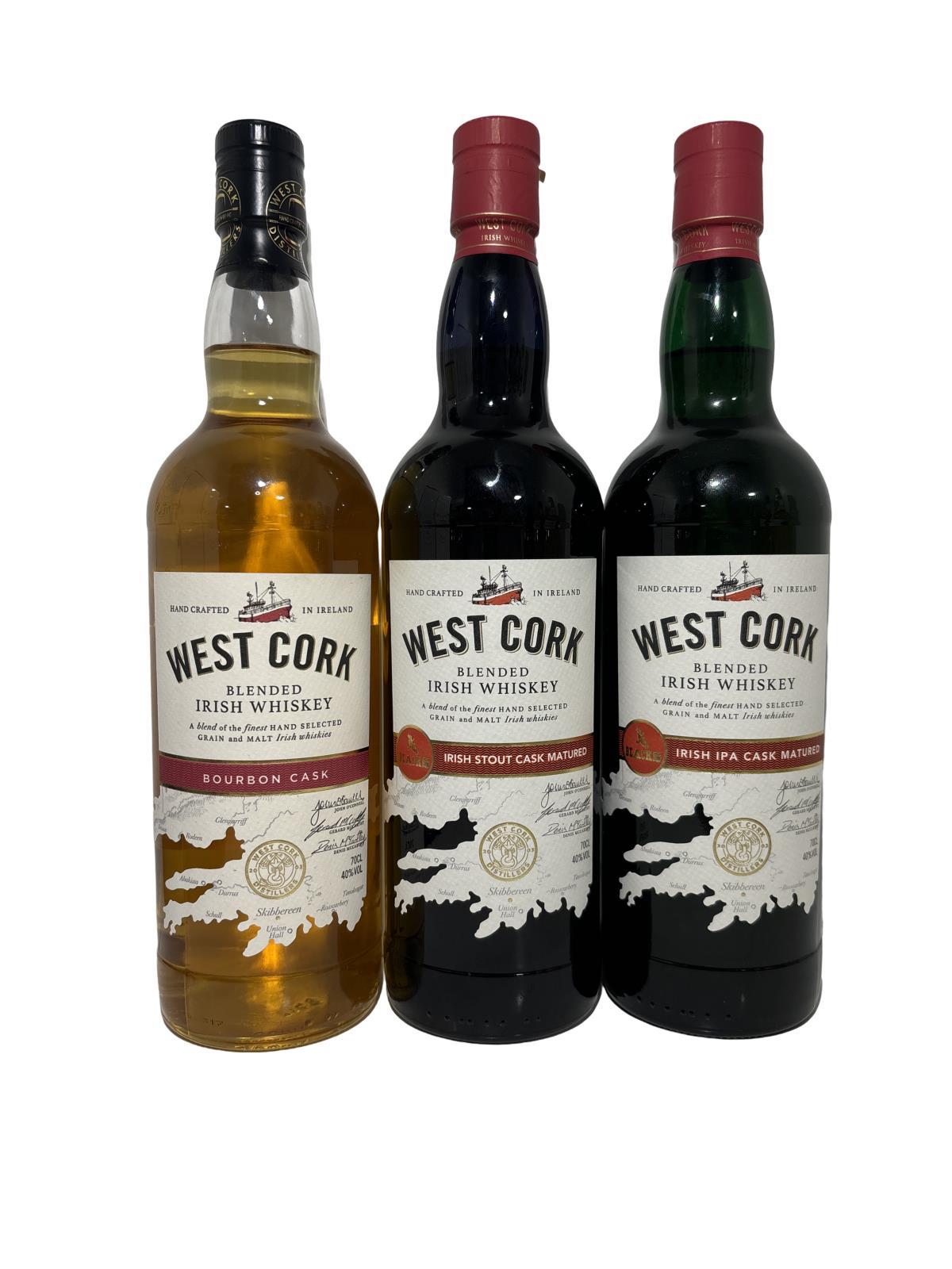 A blended whiskey that is comprised of 75% grain and 25% malt, initially matured in ex-Bourbon casks before being finished in casks that previously held Blacks of Kinsale IPA. Resulting in a full flavoured whiskey with notes of nuts, roasted malt and sweet undertones. West Cork Irish Stout Cask Matured Blended Irish Whiskey is made from a delicate blend of grain (75%) and malt (25%) whiskey. It is aged in first fill bourbon casks and then finished in casks that had held Black’s of Kinsale Stout which gives an aroma of chocolate, raisins and cracked nuts and a taste of dark chocolate, coffee and vanilla.
