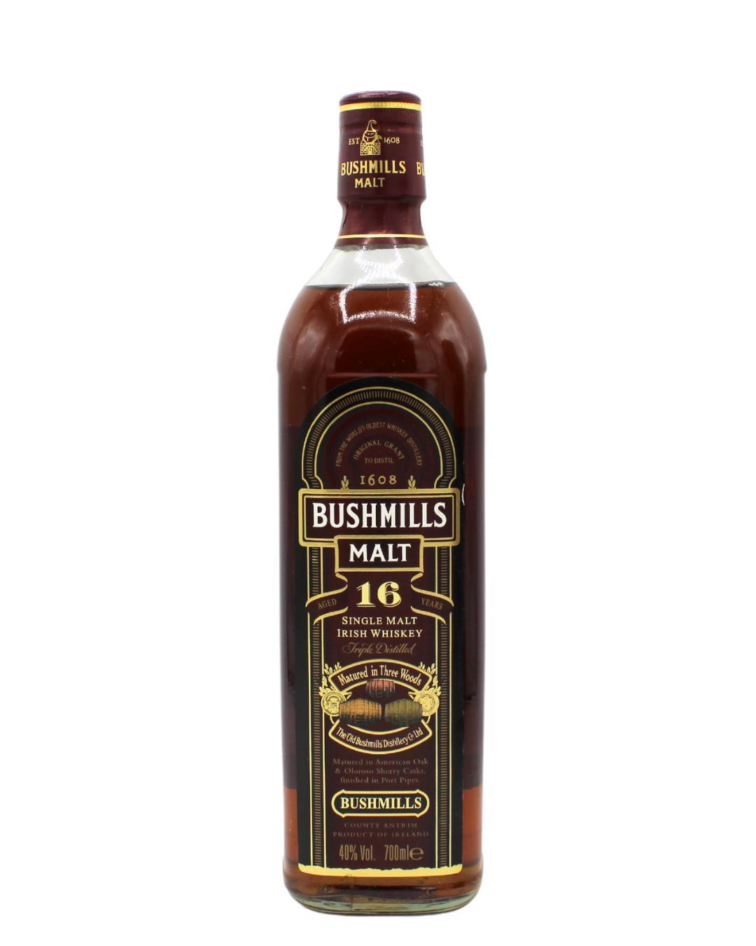 An old release of Bushmills 16. Matured in a combination of Oloroso Sherry and Bourbon casks, this 16-Year-Old Single Malt is then finished in Port pipes, adding depth and richness to its character. The result is a beautifully balanced whiskey with layers of dried fruit, nuts, and subtle spice, complemented by the sweetness and complexity imparted by the Port finish.
