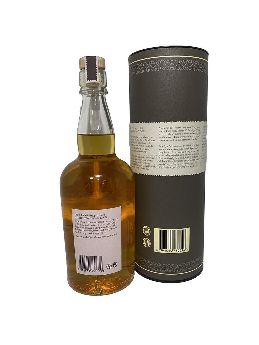 Award-winning 12YO Single Malt, finished in Bourbon. The Ryans have been whiskey people for 6 generations. Tipperary man John worked in the 1820’s in Limerick Distillery (Walker’s). Michael worked in Birch’s Roscrea and supplied barley from the nearby home place in Toomevara. Thomas set off for Dublin in the mid 1890’s, and after a long vintner’s apprenticeship started independent sourcing and finishing of the finest of Irish single malt, culminating in Ryan’s Malt (supplied around the city and in his own pubs, starting with the first – the iconic Beggars Bush – bought in 1913 and still in the family). Jack honed the craft further, till the near demise of Irish whiskey brought a hiatus. Eunan revived the family tradition in 2013, to award-winning effect, and the next generation is getting involved already. The Jack Ryan Whiskey Co plans annual CS, single cask and small batches, through traditional and novel finishes and collaborations. Jack Ryan 12YO has to date garnered an Irish Whiskey Award and a San Francisco World Spirits Gold.