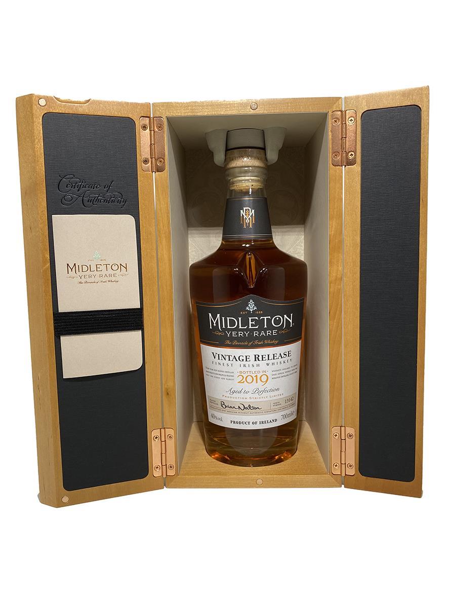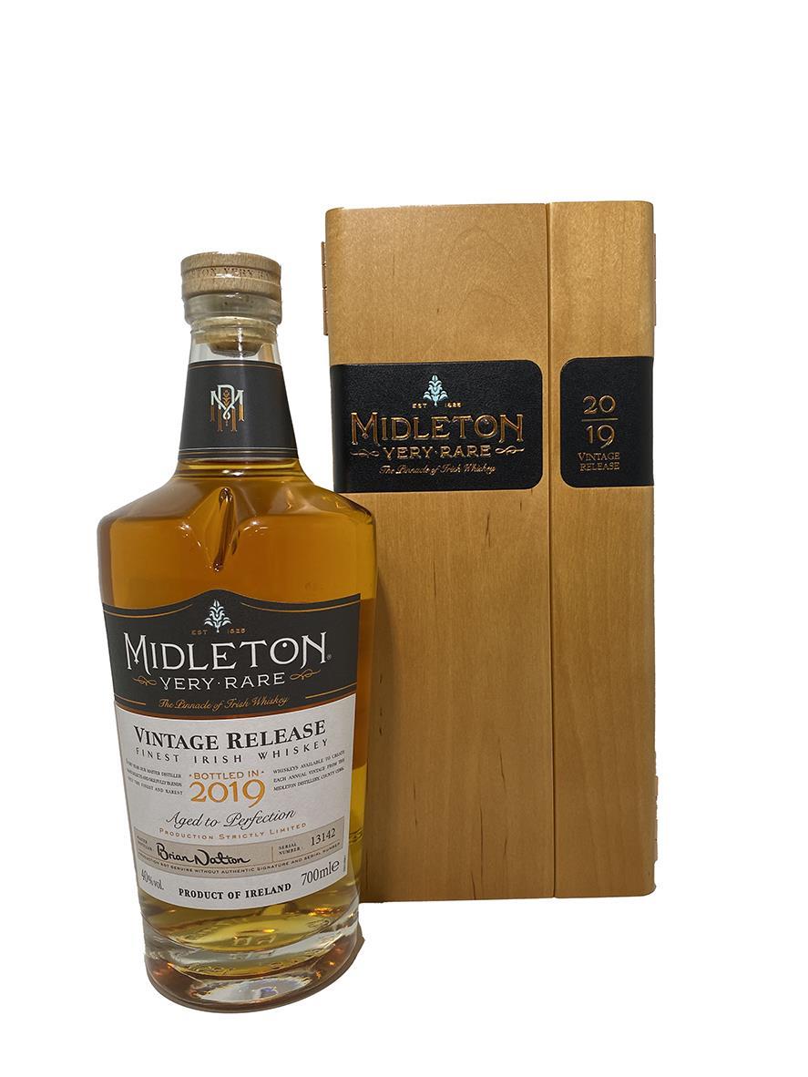 The Midleton Very Rare 2019, is a bottling brought out by the Midleton Distillery in Co. Cork. The ‘Midleton Very Rare’ range was launched in 1984 and a new vintage has been released every year since then. Barry Crockett started off the ‘Midleton Very Rare’ range while he was the Master Distiller of Midleton Distillery, in 2013 Barry Crockett retired from his role of Master Distiller. From 2014 onwards Brian Nation has been creating the ‘Midleton Very Rare’ range, maintaining its role as standard-bearer and pinnacle of Irish Whiskey.This is his last Bottling. The bottle and gift box in great condition also include the cert and distillery invite. Bottle number