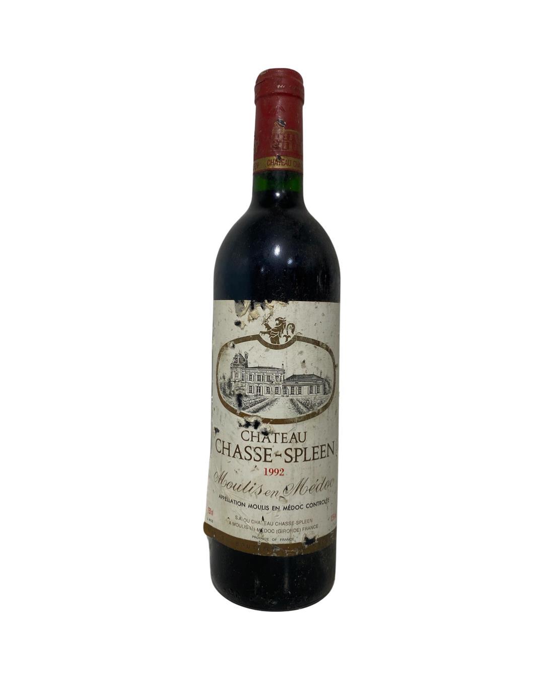 Chasse-Spleen 1992 is a blend of Cabernet Sauvignon, Merlot and Petit Verdot . The wine is aged for 12 to 18 months in French oak barrels, 40% of which are new. The 1992 vintage had a cold winter that eventually turned into a warm spring causing early flowering. However, these mild conditions did not last as the summer saw the most precipitation of any summer in the last 50 years. This led to a burst of growth and green harvesting was a necessity. A cool September might have recovered the vintage, but the continuous downpour during the October harvest period did not improve the situation. Some tears to the label as seem in the image.
