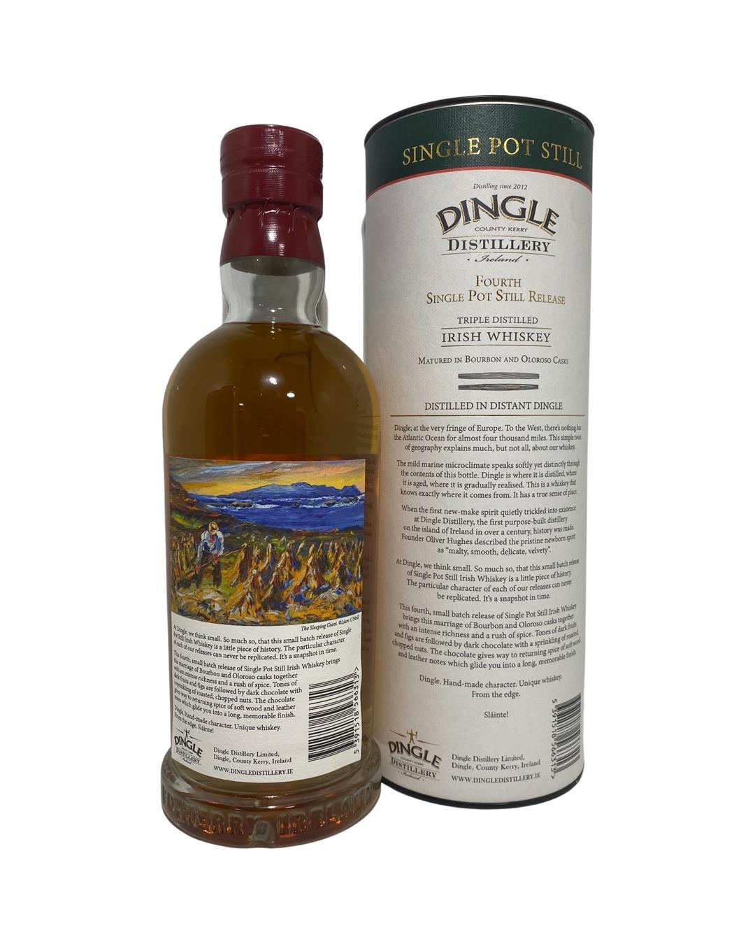 The highly anticipated fourth release of the small batch single pot still whiskey from Dingle Disitillery. Matured in a combination of Bourbon and Oloroso casks resulting in complex whiskey with rush of spice and deep richness. Tones of dark fruits and figs are followed by dark chocolate with a sprinkling of roasted, chopped nuts. The chocolate gives way to returning spice of soft wood and leather notes which glide you into a long, memorable finish.