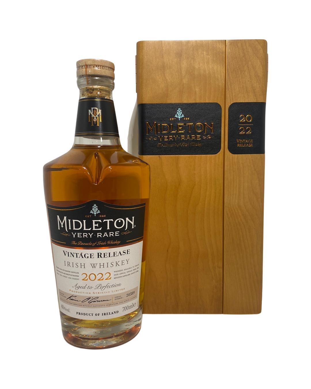 The 2022 edition to Ireland's most premium and beloved whiskey series; Midleton Very Rare. This is the 39th installment and the first release under Kevin O' Gorman appointed Master Distiller of the Midleton Distillery in 2020. Both the bottle and gift box are in very good condition, certificate and distillery invite are also included. The Midleton Very Rare range of whiskeys is a collection of highly regarded Irish whiskeys crafted at the Midleton Distillery in County Cork, Ireland. With a reputation for excellence, these whiskeys are known for their exceptional quality, craftsmanship, and limited availability. Characterized by smoothness, complexity, and depth of flavour, Midleton Very Rare often exhibits notes of ripe fruits, honey, vanilla, spices, and oak. The component casks are typically aged for around 12-27 years but each yearly batch is unique and for this reason the whiskeys are highly collectible. To this day the Midleton Very Rare series is still regarded as the pinnacle and benchmark for ultra-premium blended Irish whiskeys.
