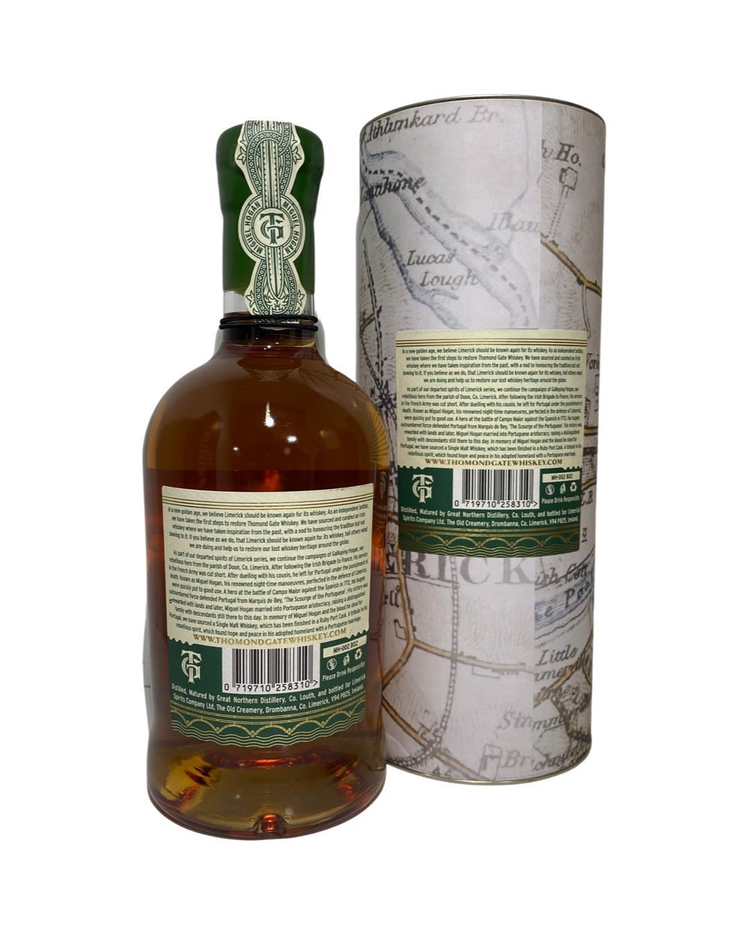 Having followed the Irish Brigade to France, his service in the French Army was cut short. He left for Portugal known as Miguel Hogan, his renowned night-time manoeuvres, perfected in the defence of Limerick, were quickly put to good use. In memory of Miguel Hogan and the blood he shed for Portugal, Thomond Gate sourced a Single Malt Whiskey, which has been finished in a Ruby Port Cask. A tribute to his rebellious spirit, which found hope and peace in his adopted home and with a Portuguese marriage. Both the bottle and gift tube are in great condition
