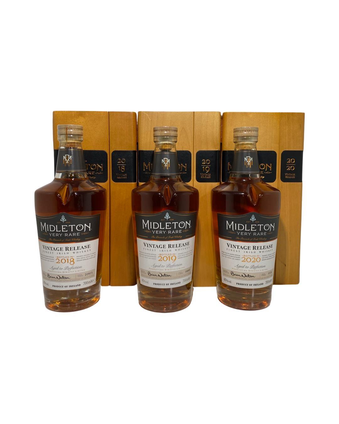 A set of 3 from the Midleton Very Rare series. The Midleton Very Rare range of whiskeys is a collection of highly regarded Irish whiskeys crafted at the Midleton Distillery in County Cork, Ireland. With a reputation for excellence, these whiskeys are known for their exceptional quality, craftsmanship, and limited availability. Characterized by smoothness, complexity, and depth of flavour, Midleton Very Rare often exhibits notes of ripe fruits, honey, vanilla, spices, and oak. The component casks are typically aged for around 12-27 years but each yearly batch is unique and for this reason the whiskeys are highly collectible. To this day the Midleton Very Rare series is still regarded as the pinnacle and benchmark for ultra-premium blended Irish whiskeys.