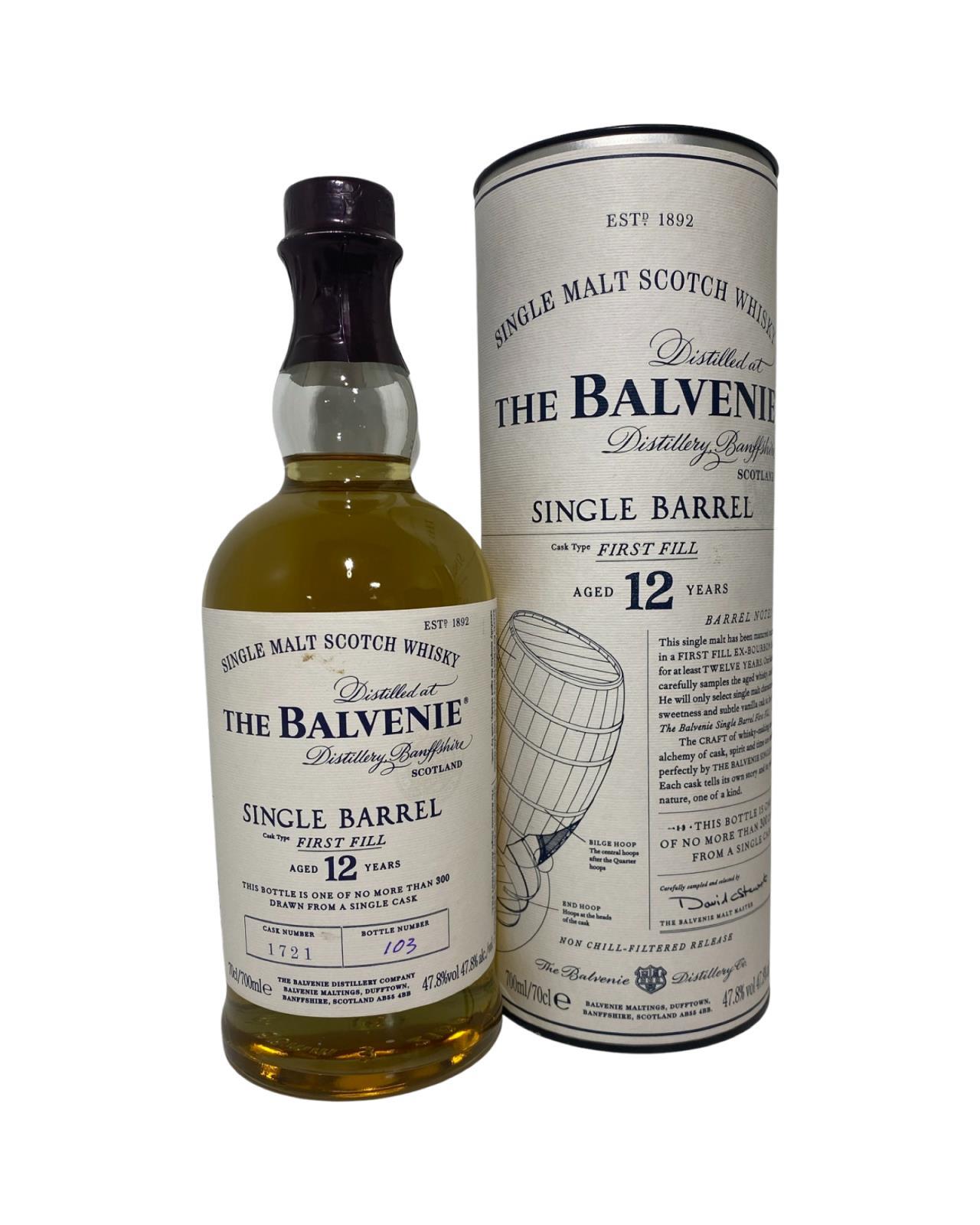 The Balvenie Single Barrel First Fill is a 12 year old single malt whisky, aged in a first fill, ex-bourbon cask. A series of “limited editions” Each bottle is one of no more than 300 drawn from a single cask and carries the number of the cask in which it matured. This is bottle 103 from cask 1721