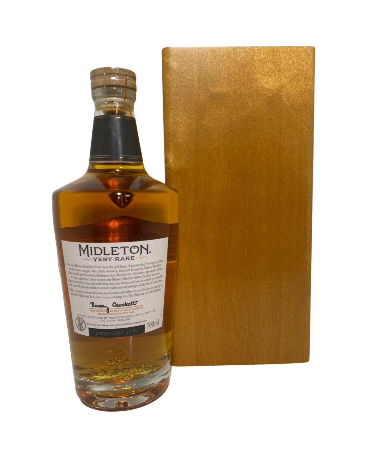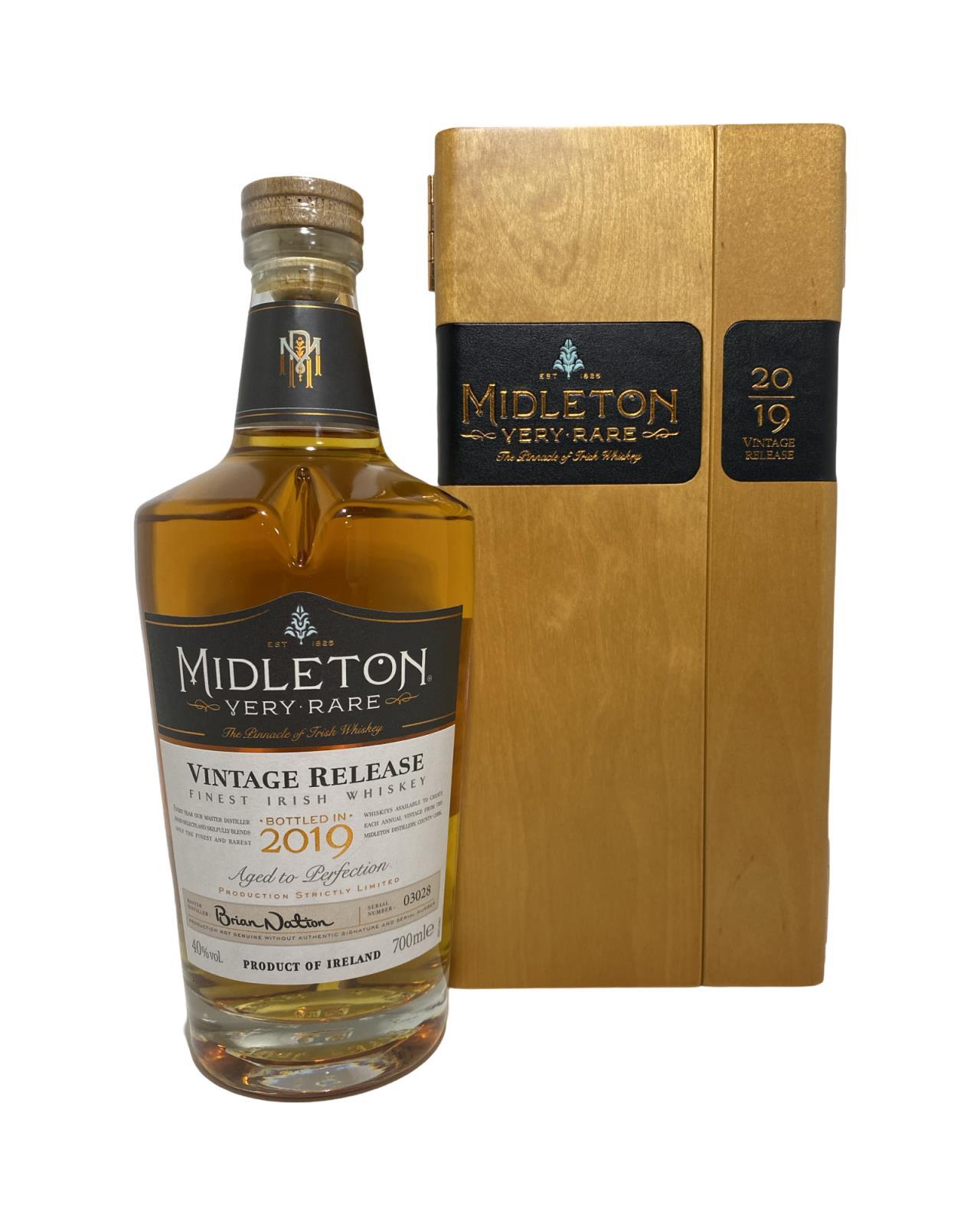 The Midleton Very Rare 2019, is a bottling brought out by the Midleton Distillery in Co. Cork. The ‘Midleton Very Rare’ range was launched in 1984 and a new vintage has been released every year since then. Barry Crockett started off the ‘Midleton Very Rare’ range while he was the Master Distiller of Midleton Distillery, in 2013 Barry Crockett retired from his role of Master Distiller. From 2014 onwards Brian Nation has been creating the ‘Midleton Very Rare’ range, maintaining its role as standard-bearer and pinnacle of Irish Whiskey. The bottle and gift box in great condition also include the cert and distillery invite.