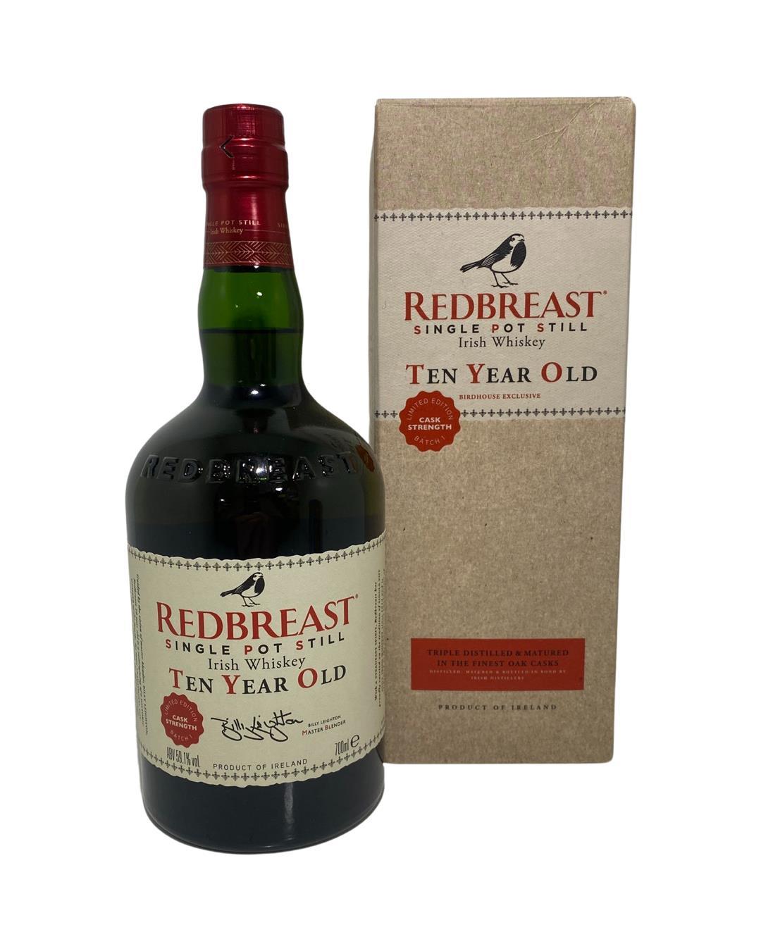 Redbreast 10 Year Old Cask Strength Batch No.1 .Distilled at the Redbreast distillery in Ireland, this triple distilled single pot still whisky was released to celebrate the 30th anniversary of the re-birth of Redbreast. Last released in the 1970s, this expression has been laid down to mature for a decade in a combination of Oloroso sherry butts and bourbon casks before being bottled at a cask strength of 59.1% abv. 700ml bottle.