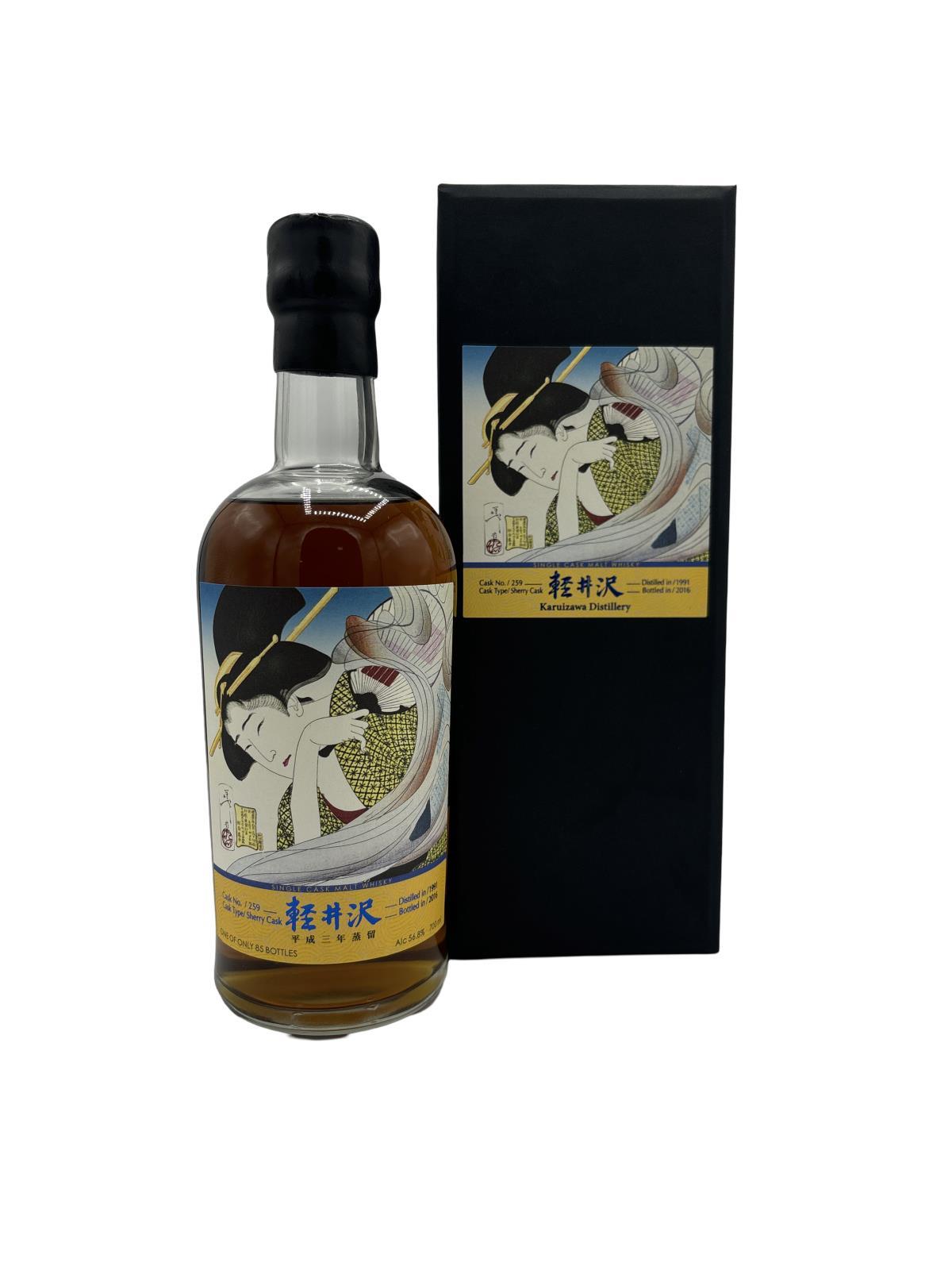 Karuizawa 1991 25 Year Old. Geisha label. Cask Strength Single Malt (Cask #259) The most cult of Japanese whiskies, closed since 2001. Famed for its intense, sherry cask matured drams, its popularity has been rapidly growing in recent years.Distilled in 1991 and bottled in 2016 after maturation in a sherry cask. Strength is 56.8%. As a standalone Geisha, this cask only yielded a modest 85 bottles making this specific Karuizawa one of the most exclusive and rarest around. Geisha are traditional Japanese artists who are professionals in music, signing, dancing and social networking.