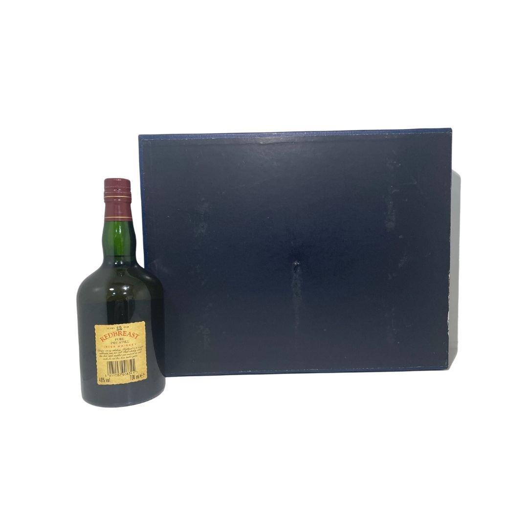 This is an old Redbreast bottle that most likely dates from the early 1990s. It bears the description 'Pure Pot Still' which was changed on Redbreast to 'Single Pot Still' in 2010. This bottle also bears the old distributor's name of Fitzgerald & Co who looked after the Redbreast brand from around 1990 to the early 2000s. The bottle is in very good condition, the label is also in very good condition and the fill level is well into the neck. There is also 4 Galway crystal tumblers.