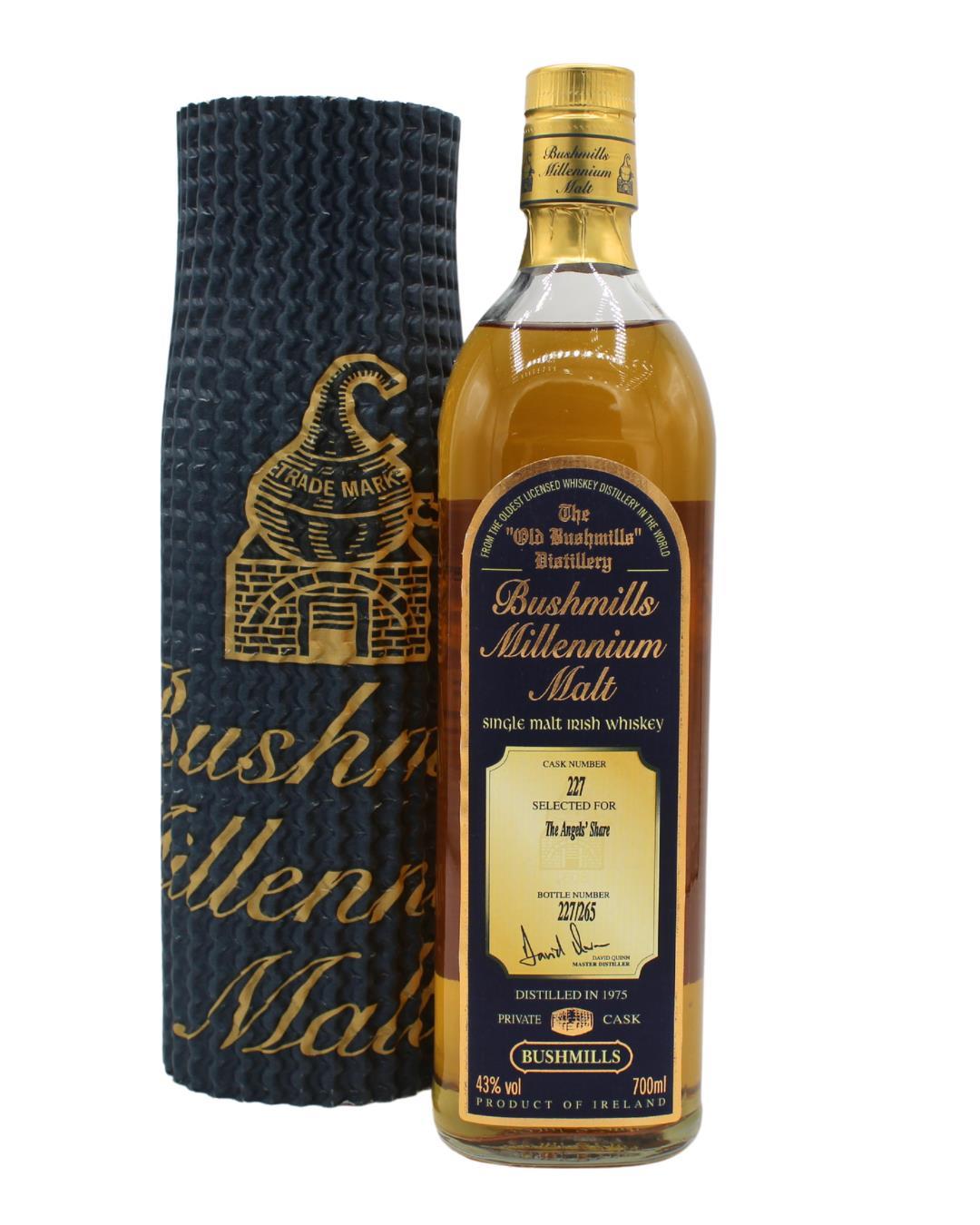 A single-cask Bushmills single malt released for the millennium, Distilled in 1975. Cask number 227, Bottle number 227/265.