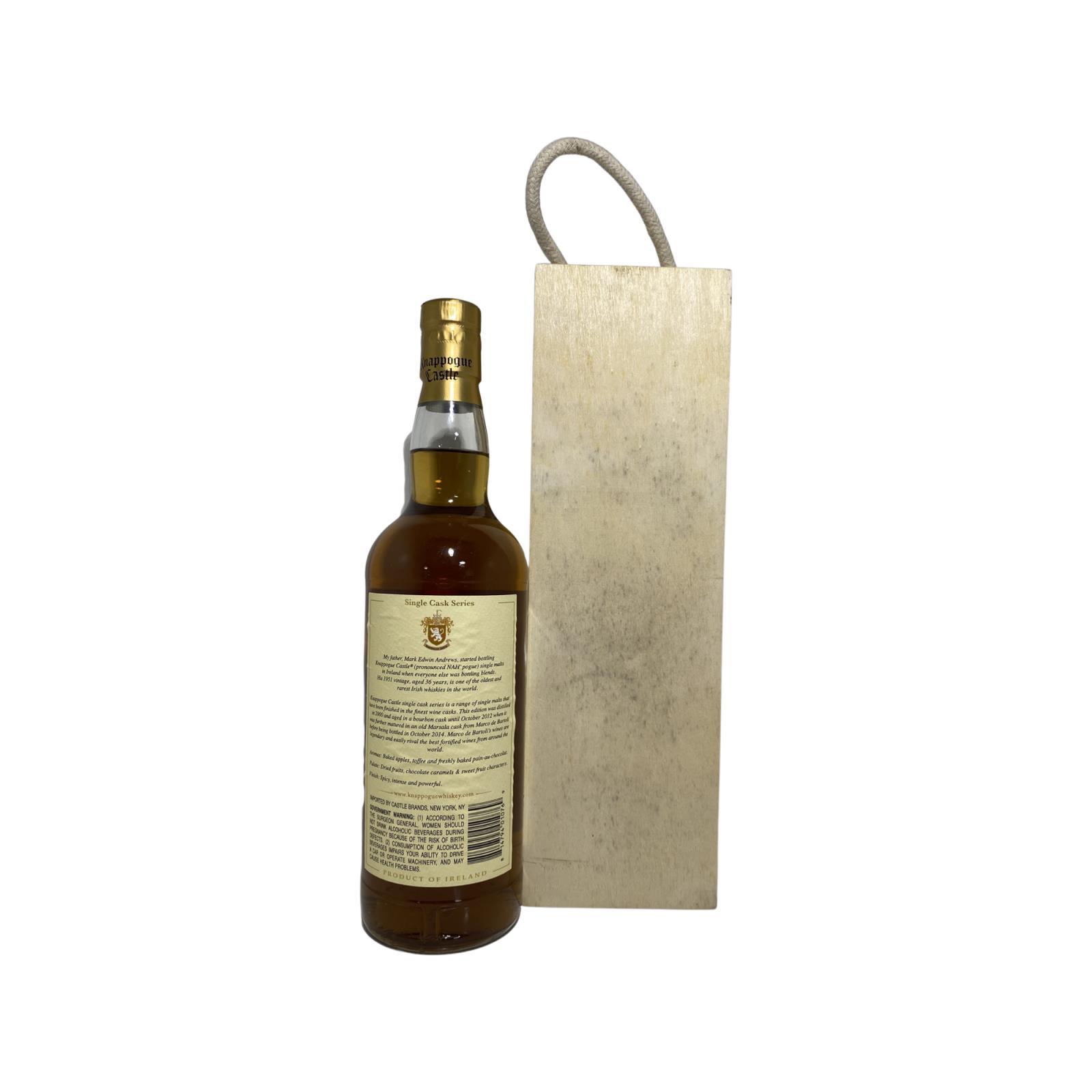 This is the first such bottling in the single cask series from Knappogue Castle.The whiskey was distilled in 2000 and initially matured in a Bourbon cask before being decanted into Marco de Bartoli barrel in October 2012, it was uncasked in Octobe r2014.This comes packaged with a wooden gift box.Cask No. 2. Edition 1.