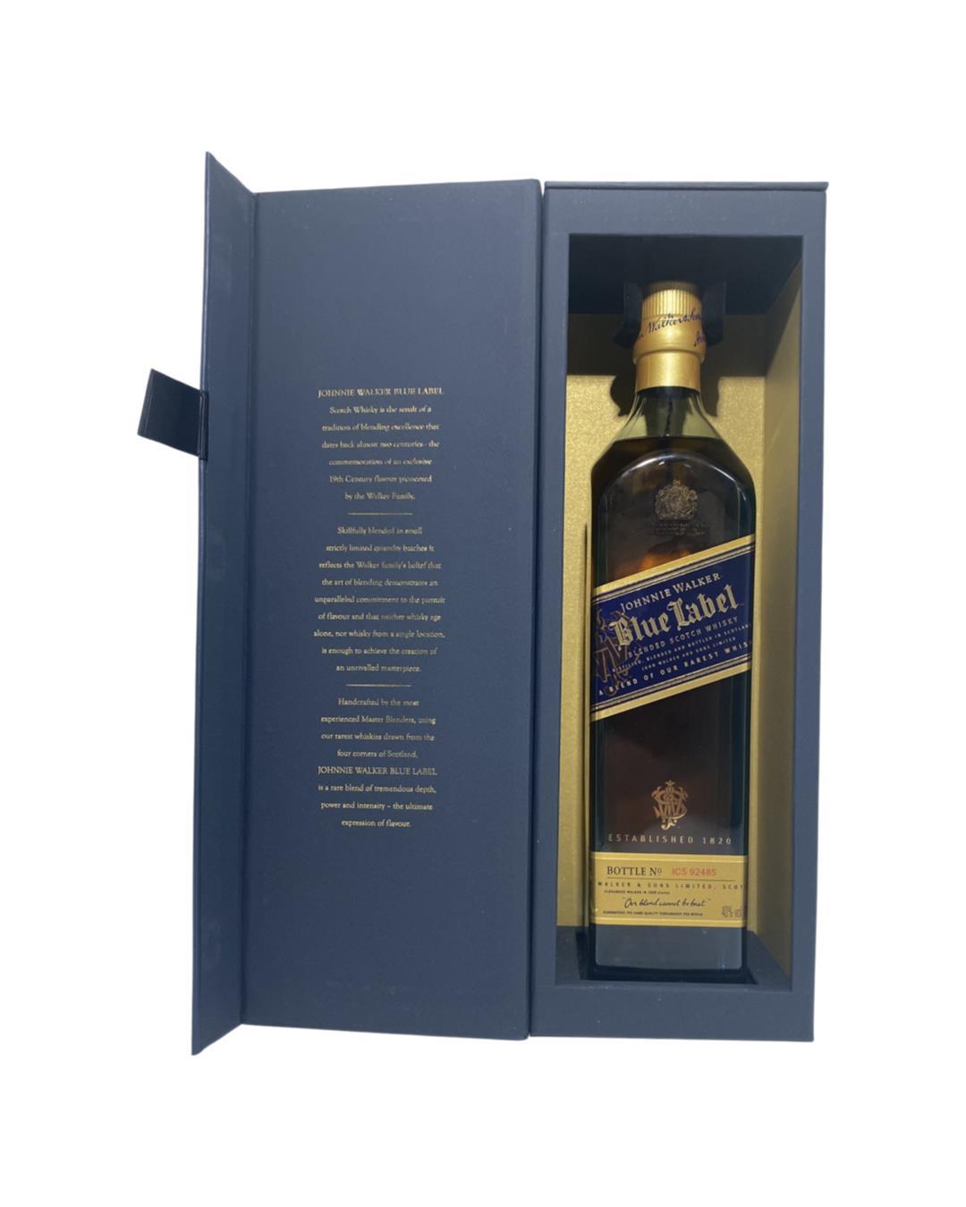 Johnnie Walker's top blend. The Blue Label is vatted from superior aged whiskeys. Johnnie Walker Blue Label sets the standard, with layers and layers of flavor from hand-selected, rare casks from across the distilling regions of Scotland. Its flavors are influenced by the smoke of the west and the rich, sweet whiskies of the east.