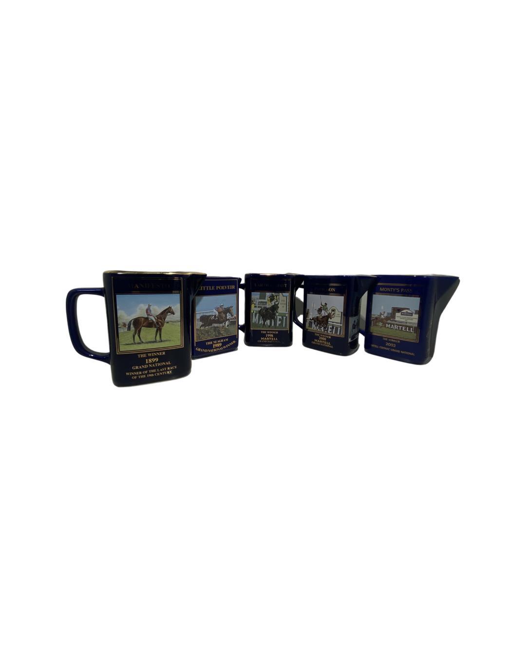 5 Martell Cornac jugs made to celebrate the Grand National and its winners from different years. Unfortunatly 2 jugs got lightly chipped but the pieces are in the Jug so it is possible to glue them back if you are so inclined. Based on the Nature of the jugs I would not recommend getting these shipped.