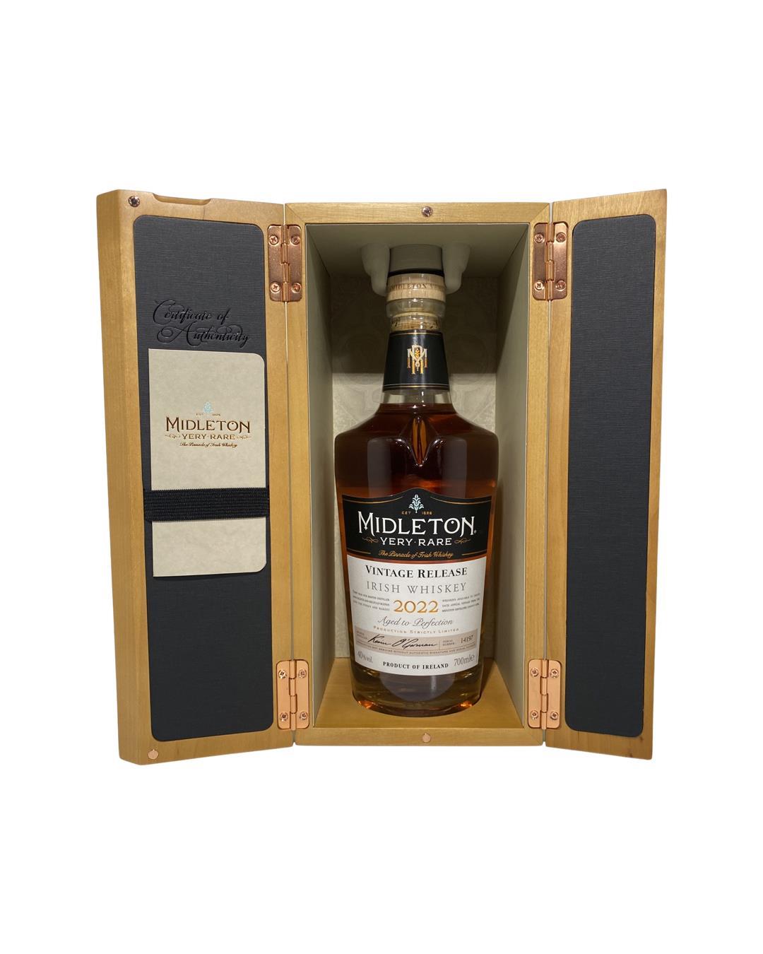 The 2022 edition to Ireland's most premium and beloved whiskey series; Midleton Very Rare. This is the 39th installment and the first release under Kevin O' Gorman appointed Master Distiller of the Midleton Distillery in 2020. Both the bottle and gift box are in very good condition, certificate and distillery invite are also included. Bottle number 14197