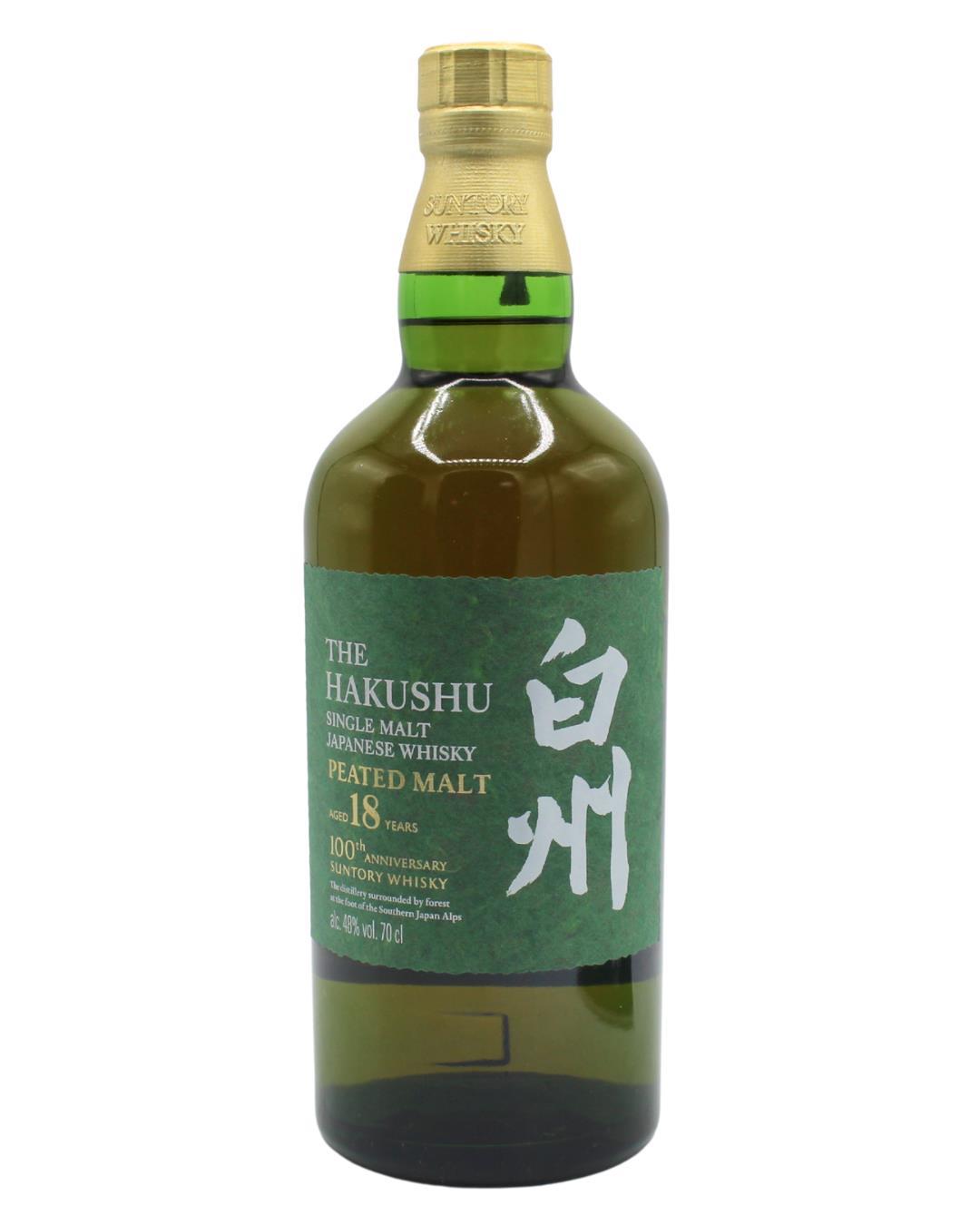 Bottled for the 100th Anniversary of the distillery, The Hakushu 18 Peated Malt is an extremely limited-edition whisky made of carefully selected malt whiskies all aged for a minimum of 18 years in various casks, created in honor of Suntory Whisky's centenary. The Hakushu Distillery blenders work with peat, while softening the palate using the exceptional mountain water of the area, filtered through ancient granite rocks. Refined and elegant, this centennial Hakushu Peated Malt brings smoke that is less strong, never dominant and in typical Japanese style, complex and gentle.