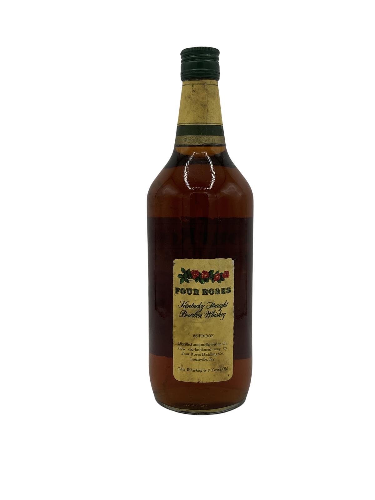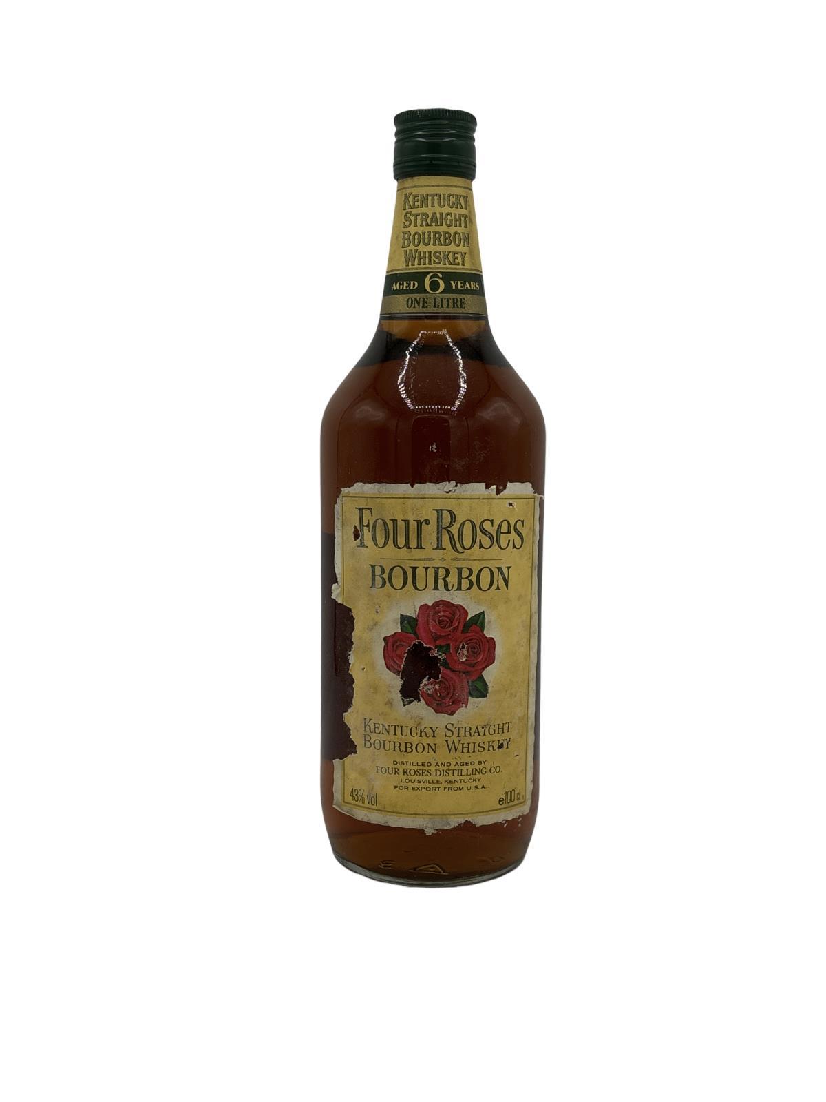 This Yellow Label bottling of Four Roses was released for the European and Japanese markets. 6 year old Kentucky Straight Bourbon Whiskey from the Four Roses distillery in Lawrenceburg, Kentucky.At this time the brand was produced by Seagram's who, preferring to promote their Seven Crown as the whiskey brand of choice in the US, limited Four Roses as a straight bourbon to the export market.