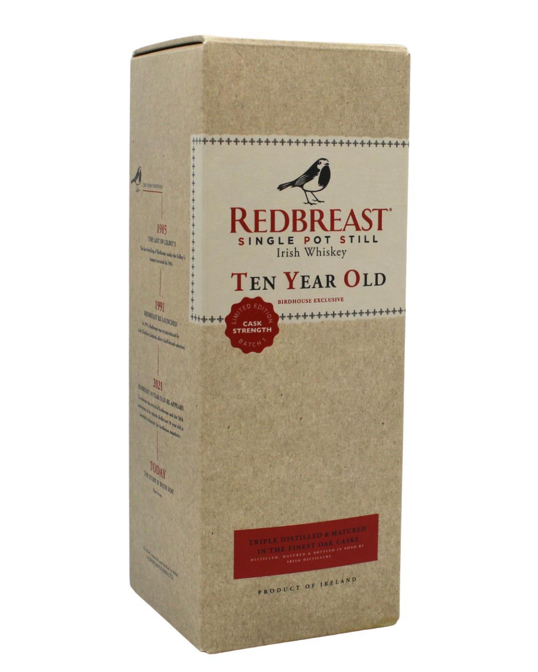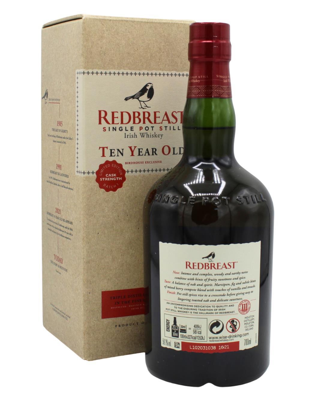 Redbreast 10 Year Old Cask Strength Batch No.1 .This triple distilled single pot still whiskey was released to celebrate the 30th anniversary of the re-birth of Redbreast. Last released in the 1970s, this expression has been laid down to mature for a decade in a combination of Oloroso sherry butts and bourbon casks before being bottled at a cask strength of 59.1%.