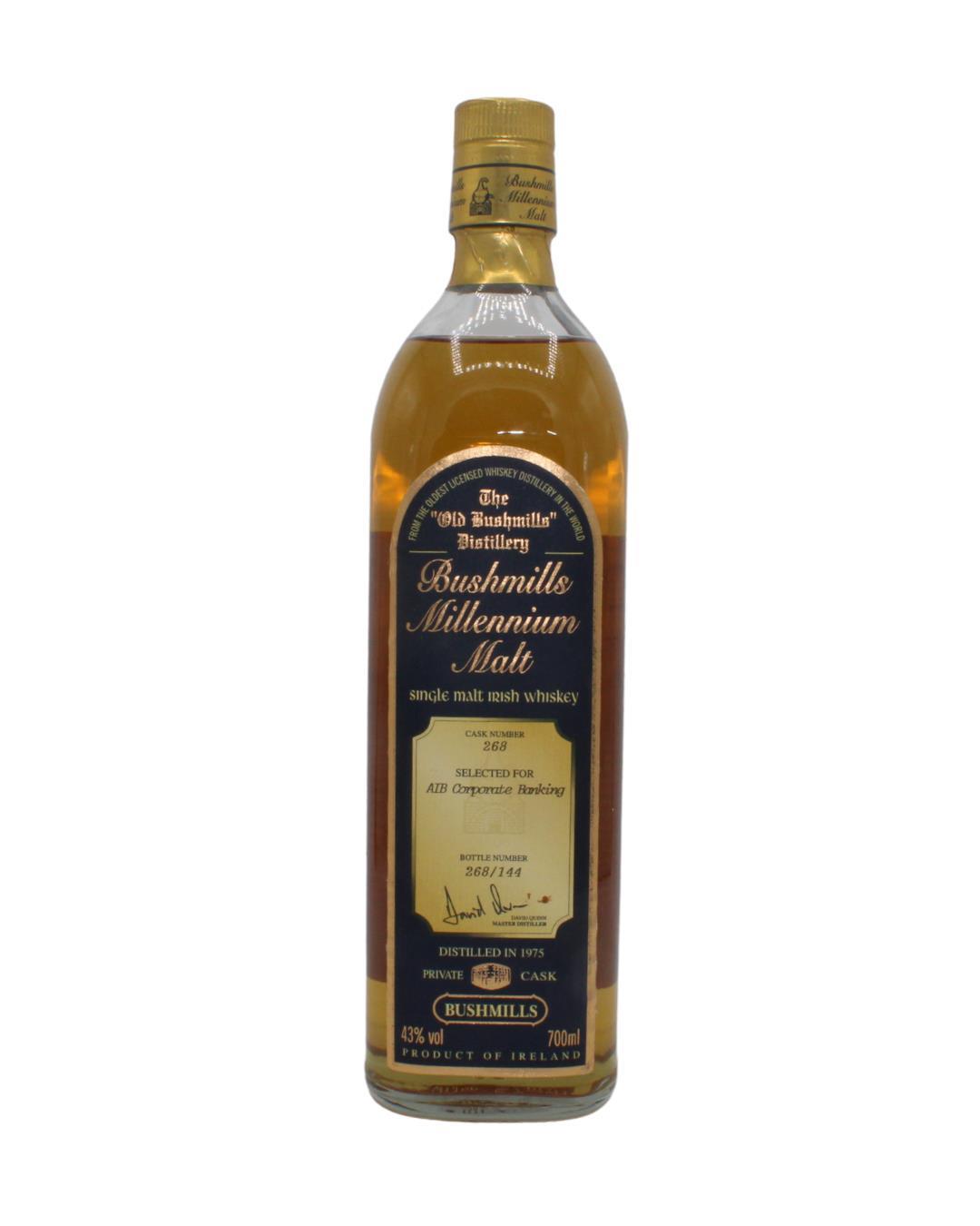 A single-cask Bushmills single malt released for the millennium, Distilled in 1975. Cask number 268, Bottle number 144.