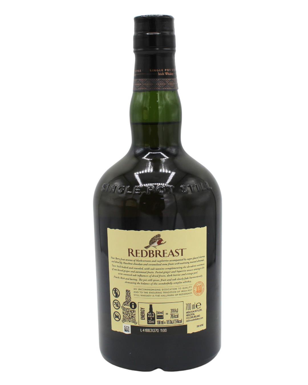 This bold Redbreast expression is elevated by the unique inclusion of cream sherry casks in its maturation. Crafted by Master Blender David McCabe, it’s aged in a combination of ex-bourbon barrels and casks seasoned with oloroso sherry, cream sherry, and ruby port. The result is a vibrant whiskey bursting with berry fruit aromas, hazelnut chocolate notes, and caramelized stone fruit sweetness, adding a captivating layer to the classic Redbreast Single Pot Still character.