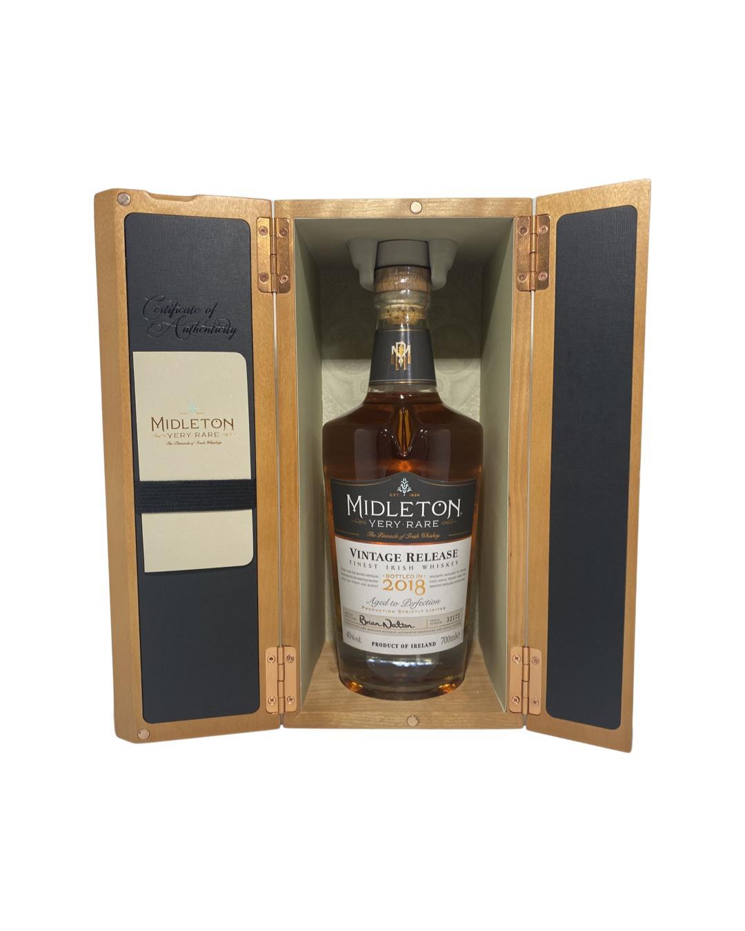 The Midleton Very Rare 2018, is a bottling brought out by the Midleton Distillery in Co. Cork. The ‘Midleton Very Rare’ range was launched in 1984 and a new vintage has been released every year since then. Barry Crockett started off the ‘Midleton Very Rare’ range while he was the Master Distiller of Midleton Distillery, in 2013 Barry Crockett retired from his role of Master Distiller. From 2014 onwards Brian Nation has been creating the ‘Midleton Very Rare’ range, maintaining its role as standard-bearer and pinnacle of Irish Whiskey. The bottle and gift box in good condition also include the cert and distillery invite. Bottle number